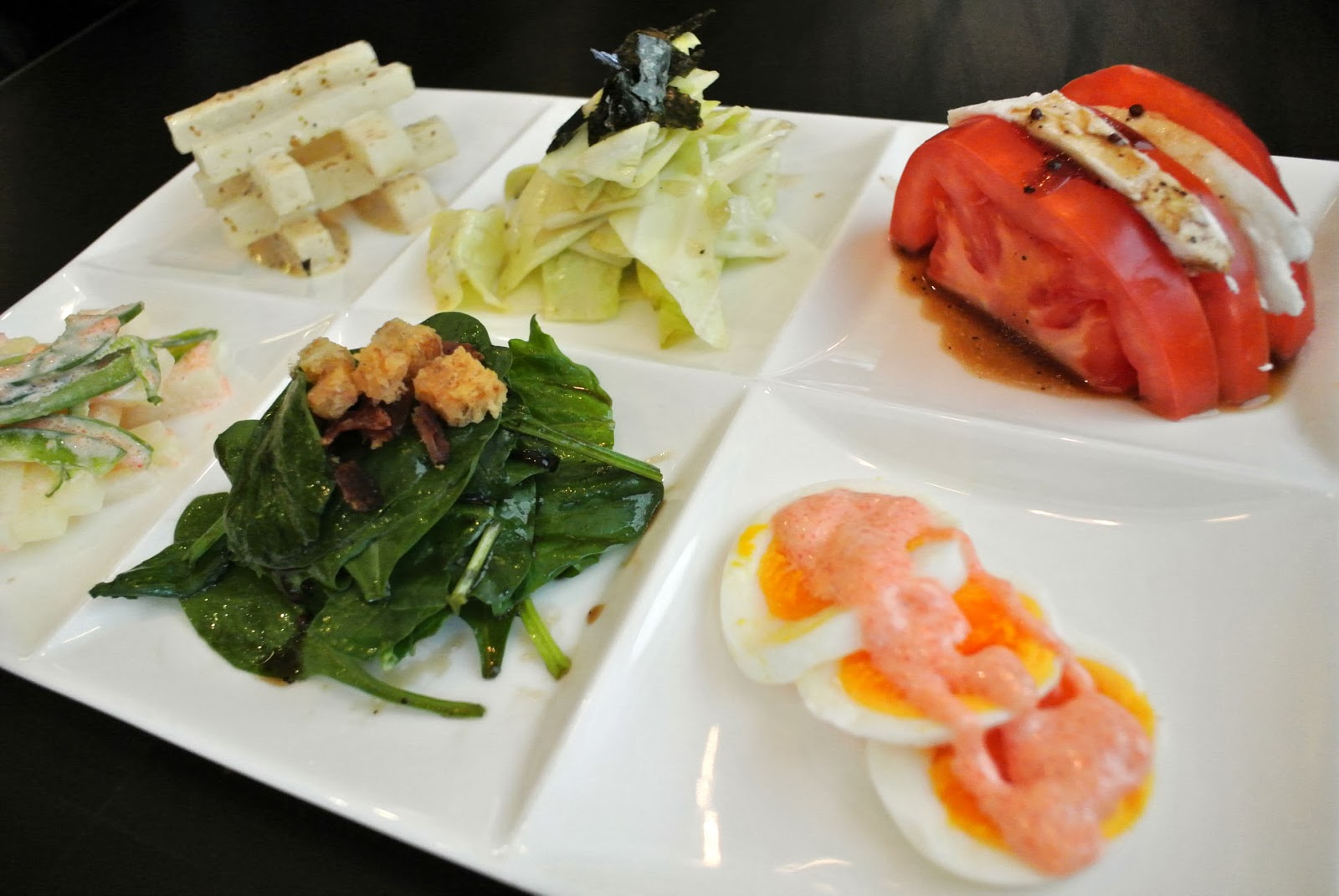 好啦,開餐了,首先是季節野菜沙律 ($95),是由五款小巧精緻又繽紛的野菜沙律,加上明太子玉子組成,當中全部沙律用料都很新鮮,蘿蔔清甜無渣、椰菜脆嫩爽甜、菠菜水靈嫩脆,全部都很不錯。當中較為特別是蕃茄芝士拌日式油醋,帶點意式的Fusion口味。