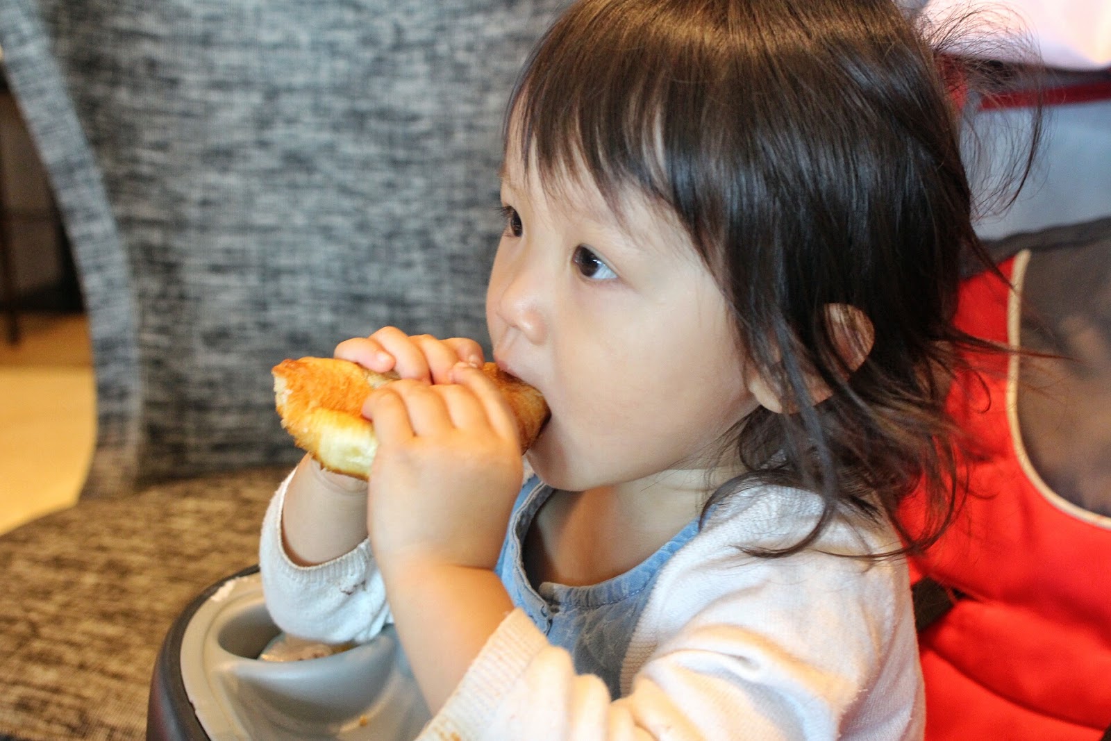 這天Matthew已經開始了暑期興趣班(遲些再分享),甜魔媽媽只帶了Chloe前來,一開首也給她拿了最愛的包包。妹妹馬上向牛角包進攻,幾下手勢就將整個包消滅,超好胃口!