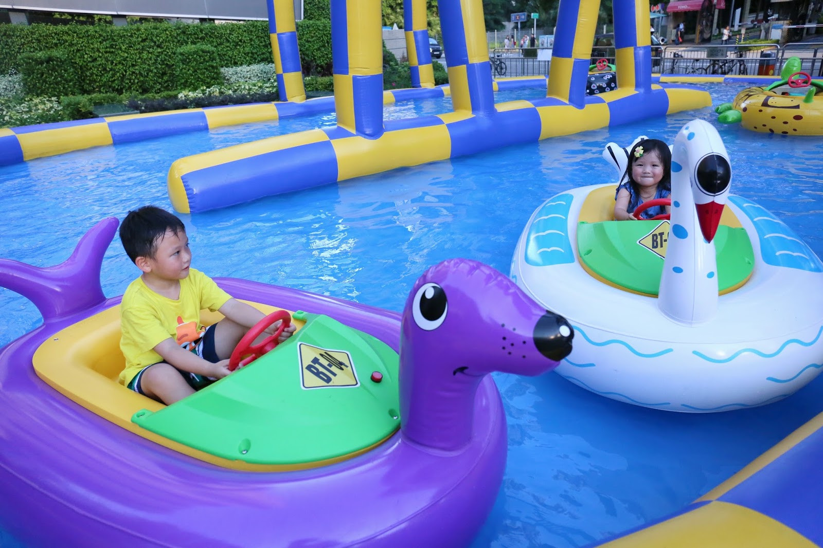 玩完這區,還有很多娛樂位!由彈床位置向下望,就是甜魔媽媽高度推介的「濕水韆鞦」區,不過小兄妹更心急要去玩「電動鴨仔艇區」,好吧~