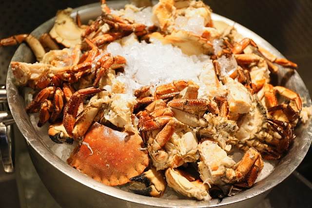 首先是港人大愛的海鮮區,選擇有我至愛的麵包蟹、熟蝦、長腳蟹、龍蝦鉗、藍青口等等,大咧咧地任君選擇。