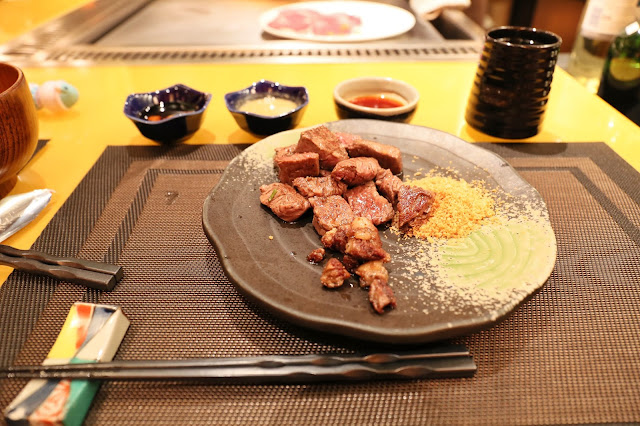 壽星同時享用了海鮮及肉類,其餘三人都是只點牛肉,份量已經很多超級飽足了!師傅先將西冷較多脂肪部分切細切碎,燒出多餘油脂,然後其他部分再燒成小排狀~