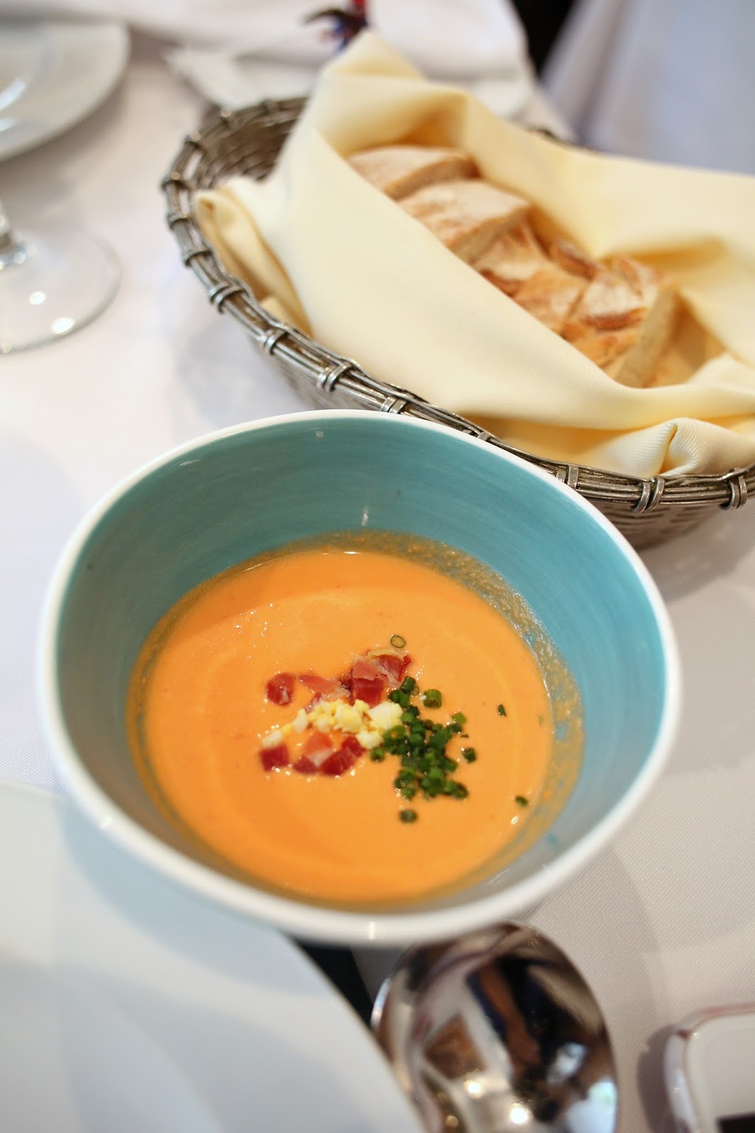 上來的路上,這隻為食豬餓了,一見到位上的 "Salmorejo" Andalusian chilled tomato soup 就馬上張碗來飲,但番茄凍湯有著挺重的生蒜味,媽媽覺得不錯,對Matthew卻有點辣,馬上扁起嘴了!在這些細微事上,還能見到他稚氣的一面,媽媽非常珍惜!
