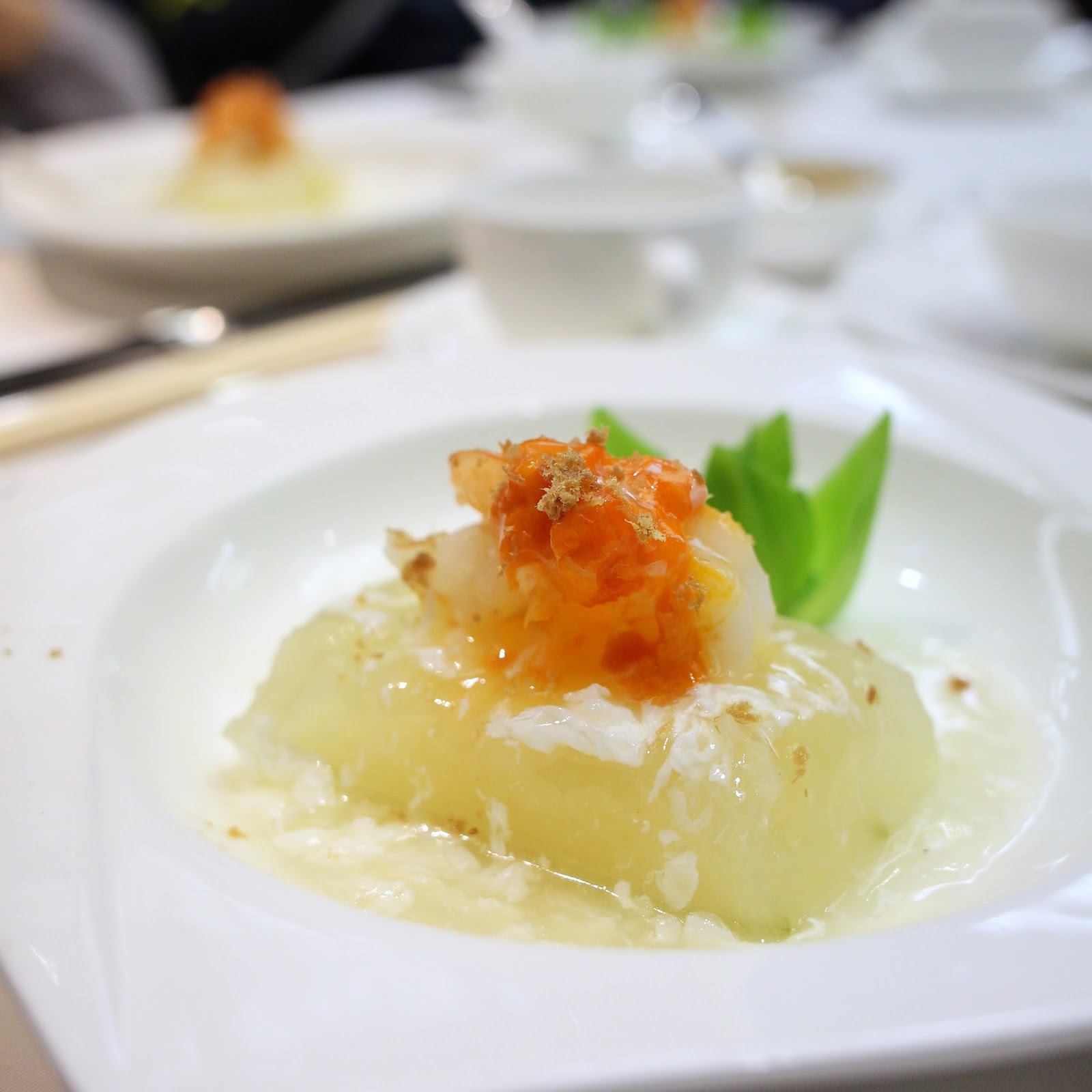 然後是老少咸宜的 腿蓉蟹皇大蝦球冬瓜脯 Steamed winter melon, prawn, minced Jinhua ham ($98/位),碩大飽滿又多膏的蝦球,吃來既鮮又爽,配合軟腍入味清甜冬瓜脯,以及腿蓉蛋白蟹皇汁,實在一點也不忍將之吃剩!