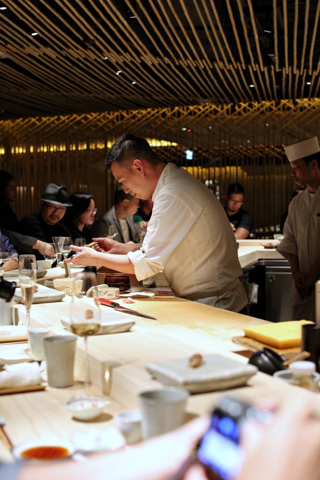 更多的環境留待大家親身探索,接下來要急不及待分享當晚美酒美食!竹 誠邀三位米芝蓮星級日本名廚---石橋正和、原榮作及鈴木將宏強勢加盟,而我們首先就坐 Sushi Bar,一邊悠然嘆香檳,一邊品嚐驚喜連連的 Omakase 美食。