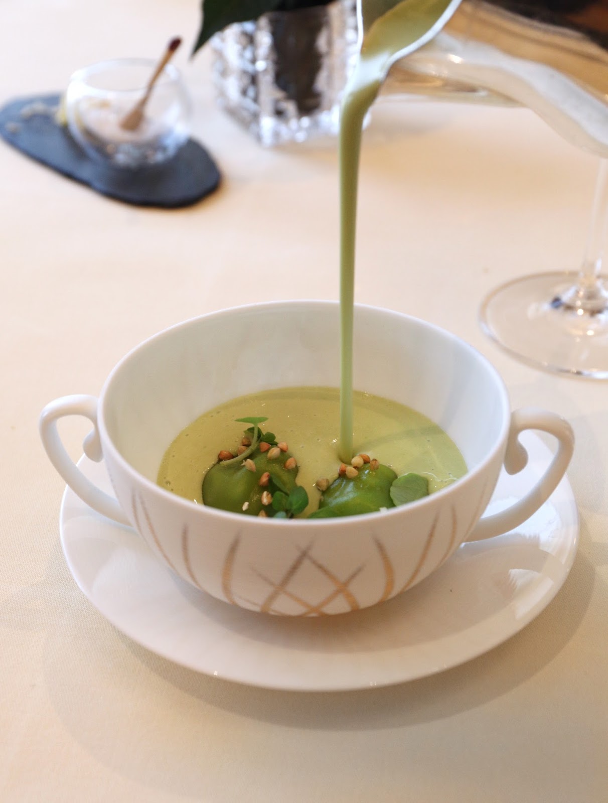 恕我跳過白酒,接著介紹 Watercress velouté, Crab ravioli and buckwheat。天知道 Chef Ricardo 在西洋菜濃湯中加了多少芝士?令原以為是很清新的口味,頓變濃郁豐富細膩,喜愛芝士的我是欣賞不得了,但不排除有人會覺得漏。