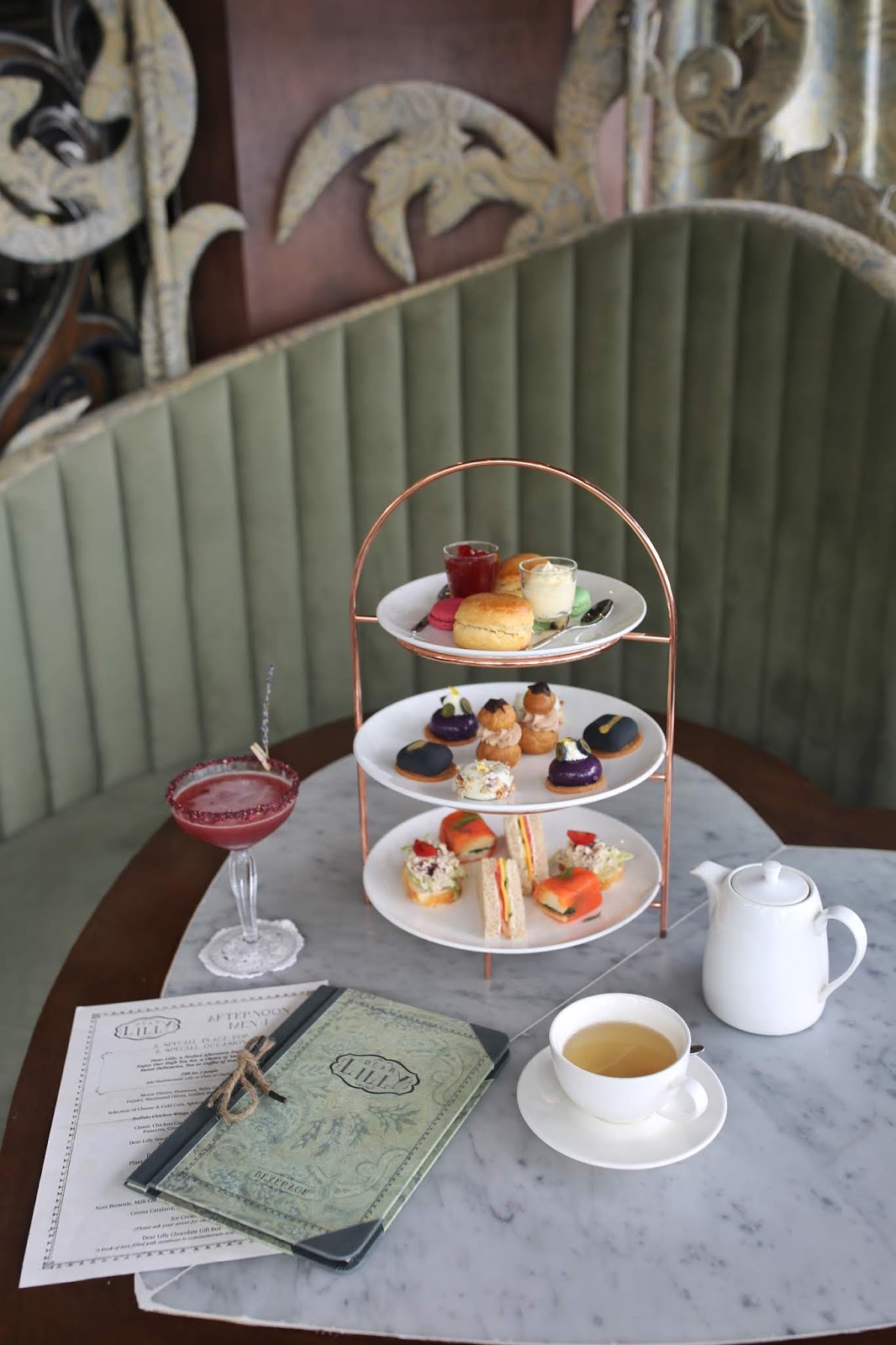 下午茶以傳統三層架呈上,頂層是英式鬆餅、忌廉、果醬以及馬卡龍,底層是三文治及鹹點,而中層就是這次主打的朱古力甜點。二人份的下午茶連同兩位咖啡或茶,我決定加$78來杯 Mademoiselle Lilly(平日散點$118),令美好的下午茶添上浪漫醉意~